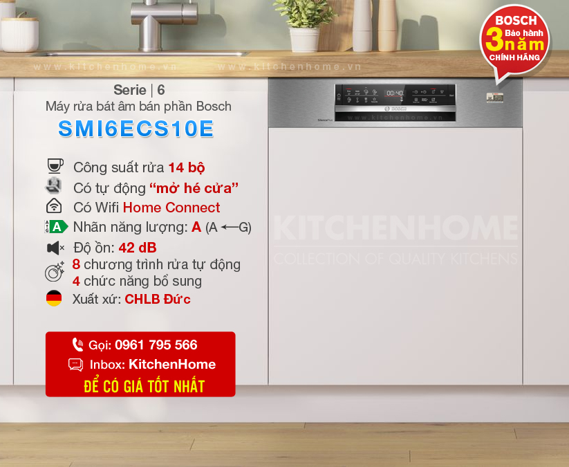 Máy rửa bát bán âm Bosch SMI6ECS10E Serie 6 đời mới nhất, được nhập nguyên chiếc từ Đức với công suất rửa 14 bộ bát đĩa Châu Âu. Bosch SMI6ECS10E gồm 8 chương trình rửa và 4 chức năng phụ trợ, thiết kế âm bán phần, dễ sử dụng. Đặc biệt, máy có tính năng tự mở cửa sau khi rửa xong giúp bát đĩa sạch khô, thơm mát, hết mùi bột rửa, được nhiều người Việt ưa chuộng.