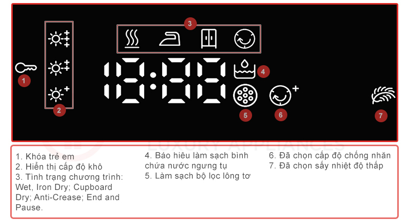 - Drying Time (Đếm ngược thời gian sấy): Điều chỉnh thời gian các chương trình sấy. Từ 20 phút đến 3 giờ với gia số 10 phút.