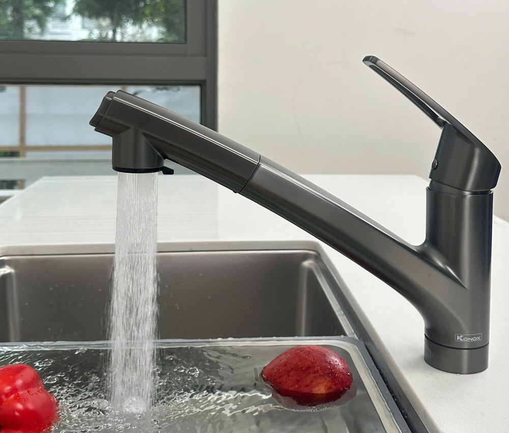 Vòi bếp Konox Kira được trang bị đầu vòi kéo rút linh hoạt, cho phép người dùng dễ dàng vệ sinh từng góc chậu, rửa thực phẩm nhanh chóng mà không bắn nước ra ngoài. Với hai chế độ nước êm dịu kết hợp với nút chuyển chế độ linh hoạt, Konox Kira không chỉ giúp khu vực bồn rửa luôn sạch sẽ mà còn mang đến trải nghiệm bếp tiện nghi, hiện đại và tinh tế đúng chuẩn Nhật.