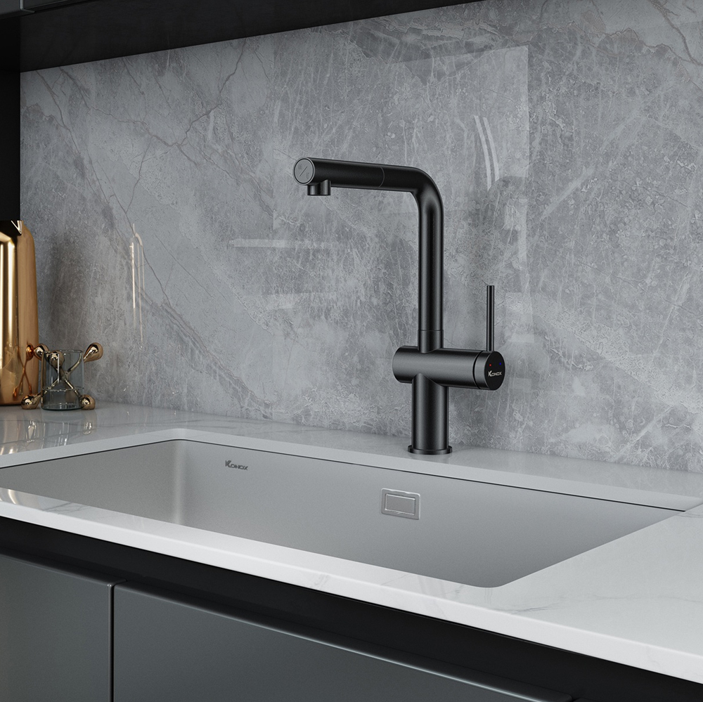 Vòi rửa dây rút Konox Stream Smart Gun Metal dáng vuông khoẻ khoắn, tối giản nhưng đầy khí chất, Konox Stream Smart Gun Metal mang đến điểm nhấn sang trọng cho mọi căn bếp hiện đại. Vòi bếp Konox Stream Smart trang bị 2 đường nước nóng lạnh, đầu vòi rút dây và thân xoay 360°, mang đến tiện nghi, tiết kiệm nước và an toàn cho sức khỏe. 2 chế độ xả nước pha lê và phun mưa giúp rửa sạch nhanh chóng và hạn chế bắn nước ra ngoài. Bề mặt mạ PVD Gun Metal 5 lớp.